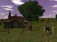 An abandoned hut. The corpse of the former resident is inside. There is an apple tree outside that drops three apples.