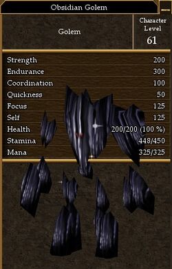 (New page: '''Introduced in:''' ??? {|width=300 border=1 !colspan=3| Obsidian Golem |- !colspan=3| Image:Obsidian Golem.jpg |- !Level: |colspan=2 align=center| 61 |- !width=100|Strength !width=1...)