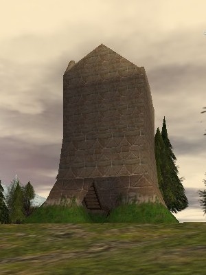 An short stone tower on top of a hill that is inhabited by 3 Brown Rats.